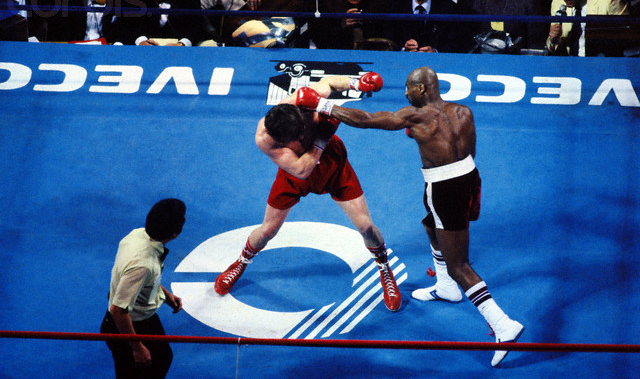 11 Feb 1983, Massachusetts, USA — Original caption: Worcheser, Mass.: Overhead view of the ring while boxer Marvin Hagler fights boxer Tony Sibson (L) for the Middleweight Championship. Hagler is connecting a strong left to Sibson’s head. — Image by © Bettmann/CORBIS