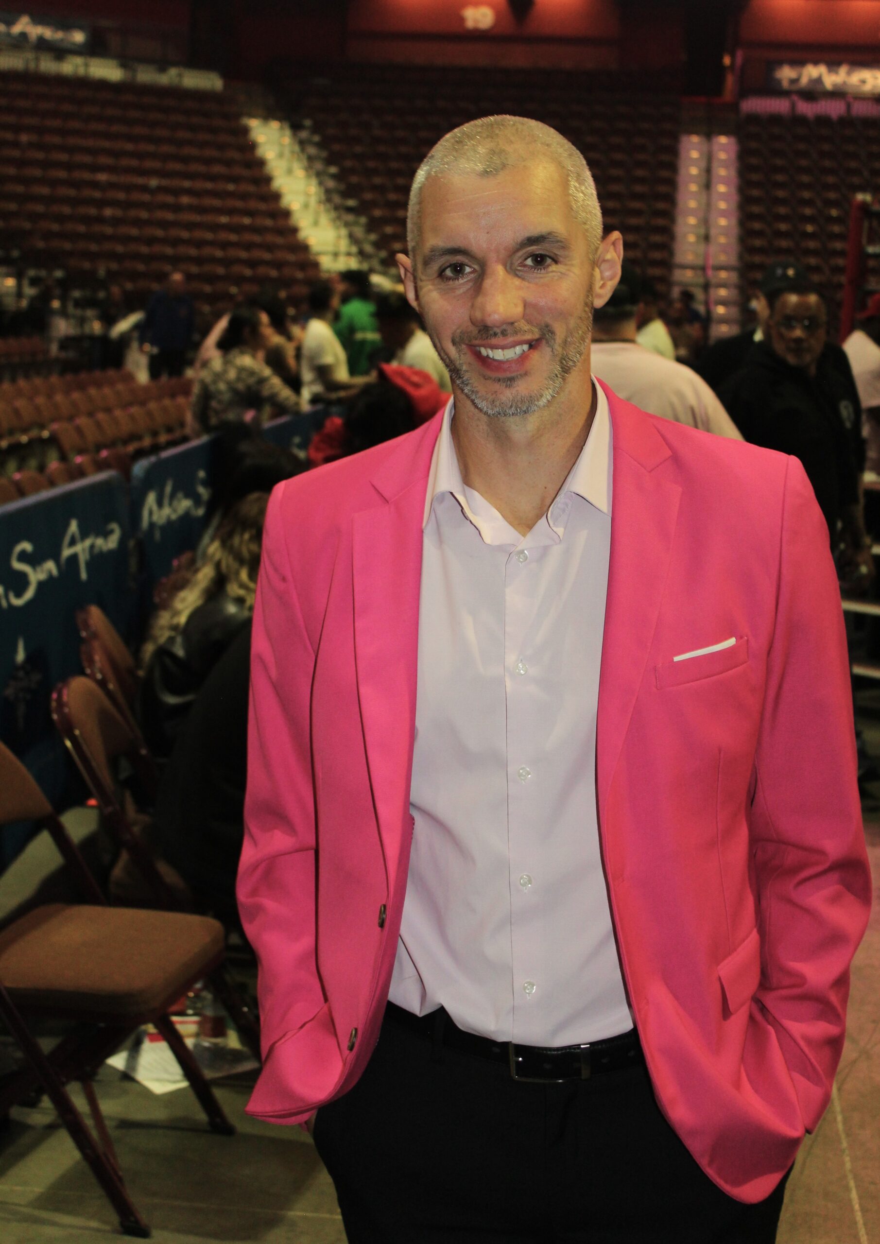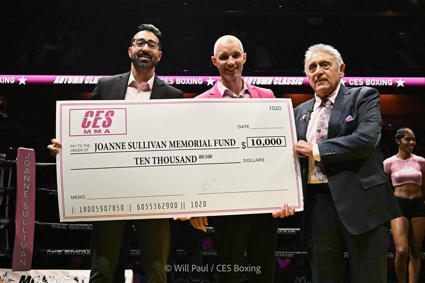 And that was the figure as of early evening November 1. Later that night, during a fight card at Mohegan Sun, Burchfield along with CES’ righthand men Michael Parente and Steve Maze, presented a jumbo-sized $10,000 check to Sullivan in support of his efforts. In addition, In addition, Burchfield supported a Pink Out as part of the night’s festivities. Every fighter wore pink gloves; CES staffers wore pink dress shirts and ties; the round card girls wore pink crop tops; Sullivan wore a pink shirt, pink blazer and pink shoes; QR codes were posted in the fight programs and around the arena inviting boxing fans to donate to the Joanne Sullivan Memorial Fund; and a table was set up in the upper concourse to encourage donations, with pink T-shirts being given to everyone contributing.