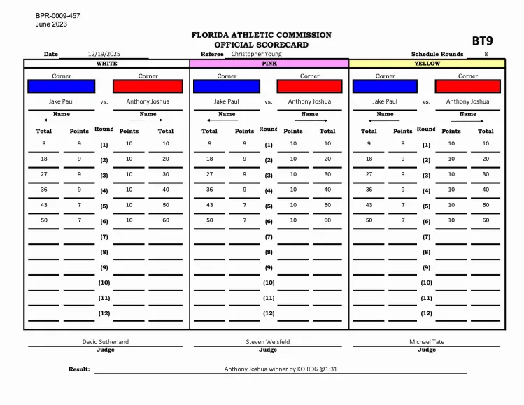 On Monday, the Florida Athletic Commission shared the scorecard for the Paul vs. Joshua fight with MMA Fighting, which showed the round-by-round scoring for the heavyweight matchup. The three judges scoring the fight were David Sutherland, Steve Weisfeld and Michael Tate.