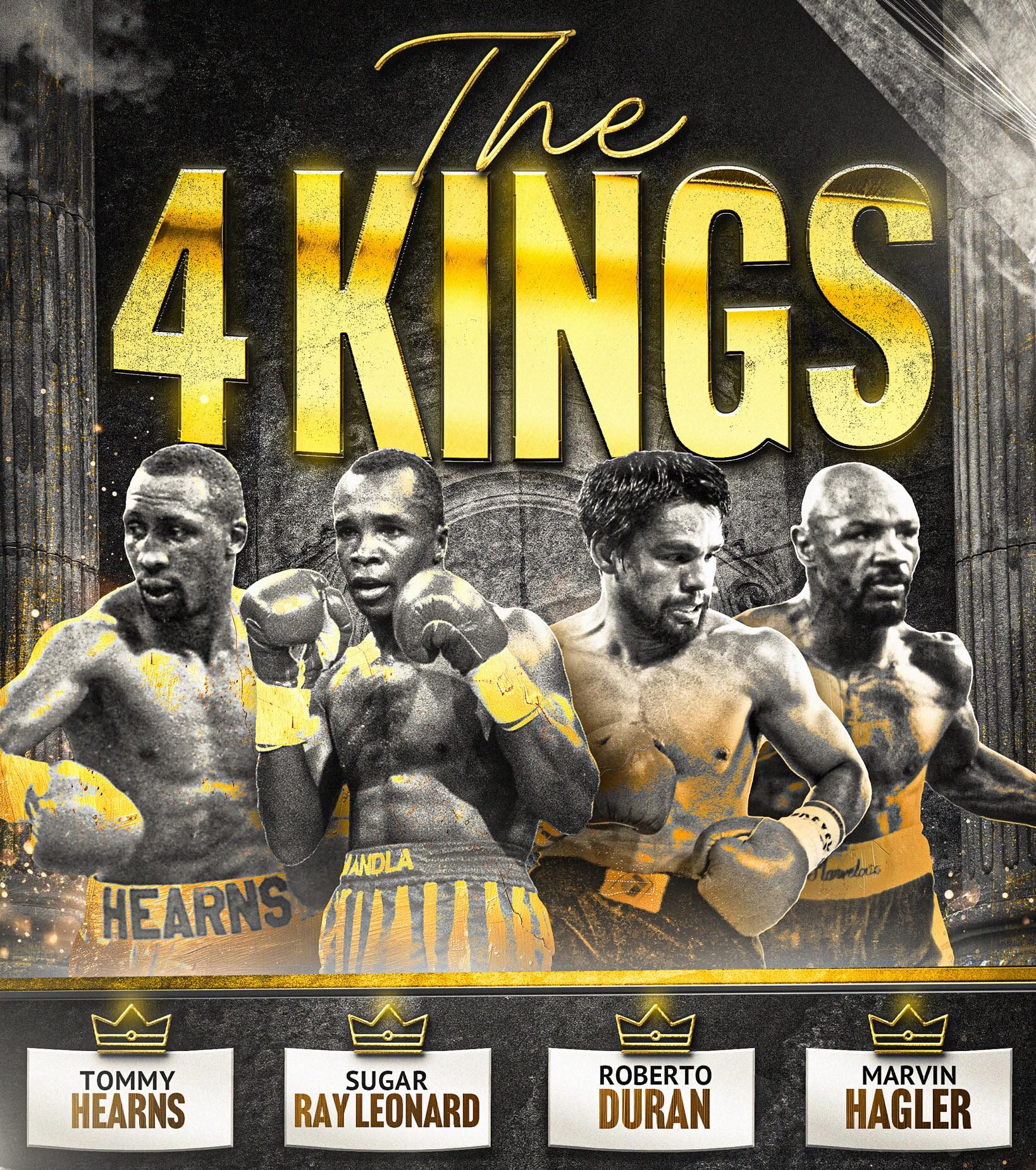 L-R. Tommy “Hitman” Hearns, Sugar Ray Leonard, Roberto “Manos de Piedra” Duran, and Marvelous Marvin Hagler.